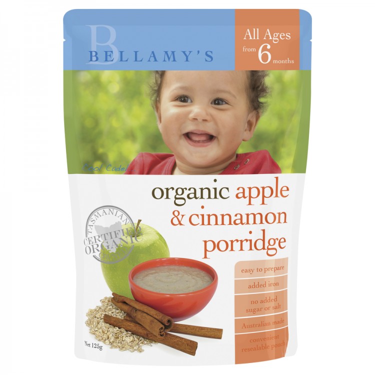 Bellamy’s Organic Apple & Cinnamon Porridge is a dry cereal of soft multigrain flakes with organic fruit juice and cinnamon, that can be quickly and easily prepared with water or baby’s usual milk. Made in Australia, Bellamy’s Organic baby foods are certified organic, and free of synthetic additives, preservatives and pesticides, giving you peace of mind that Bellamy’s Organic really is a pure start to life. A Pure Start to Life!