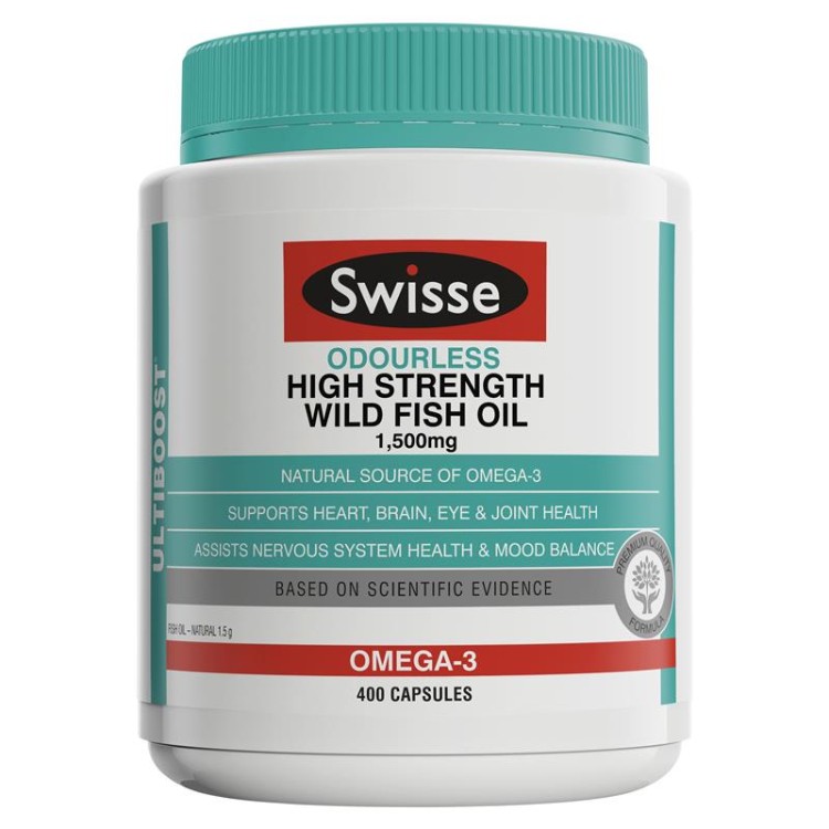 Swisse Ultiboost Odourless High Strength Wild Fish Oil contains a premium source of omega-3 beneficial for the heart, brain, joints and eyes as well as maintaining general health.